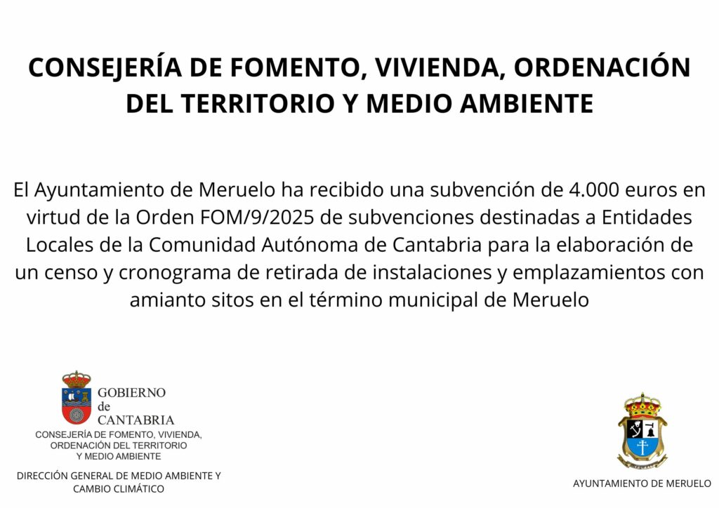 El Ayuntamiento de Meruelo ha recibido una subvención de 4.000 euros en virtud de la Orden FOM/9/2025 de subvenciones destinadas a Entidades Locales de la Comunidad Autónoma de Cantabria para la elaboración de un censo y cronograma de retirada de instalaciones y emplazamientos con amianto sitos en el término municipal de Meruelo.