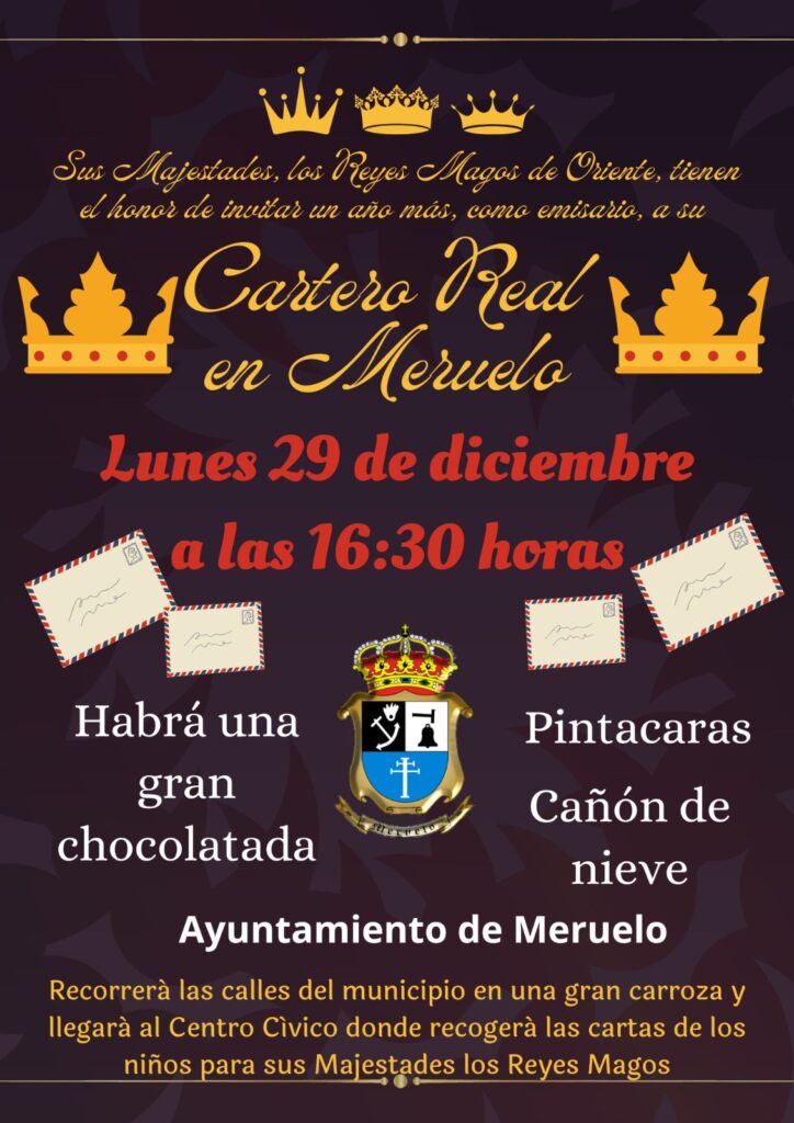El lunes 29 de diciembre el Cartero Real estará en Meruelo desde las 16:30 horas. Recorrerá las principales calles del municipio en una gran carroza y llegará al Centro Cívico donde recogerá las cartas de los niños para entregárselas a sus Majestades los Reyes Magos. Para darle la bienvenida, el Ayuntamiento ha preparado una fiesta con un gran cañón de nieve, pintacaras y una gran chocolatada.