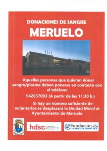 Donaciones de sangre en Meruelo 25/02/2026 – Aquellas personas que quieran donar sangre/plasma deben ponerse en contacto con el teléfono 942-637003 (a partir de las 11:30 h.)… …