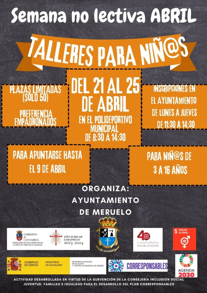 El Ayuntamiento de Meruelo ha organizado unos talleres para niños/as de cara a la semana NO LECTIVA del mes de abril. Los talleres se organizan, entre otras cosas, para facilitar la conciliación de la vida laboral con la familiar. Están dirigidos a niños y niñas con edades entre los 3 y los 16 años y se van a desarrollar de 8:30 a 14:30 en el polideportivo municipal.